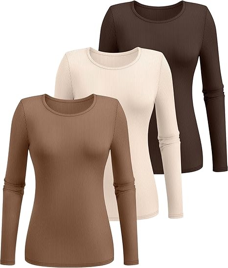 Ficerd 3 Pack Women's Ribbed Long Sleeve Tops, Crew Neck Slim Fit Undershirts Knit Basic Casual Stretch Layering Tee Shirts