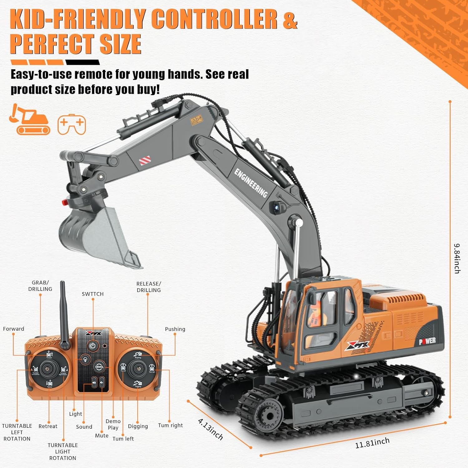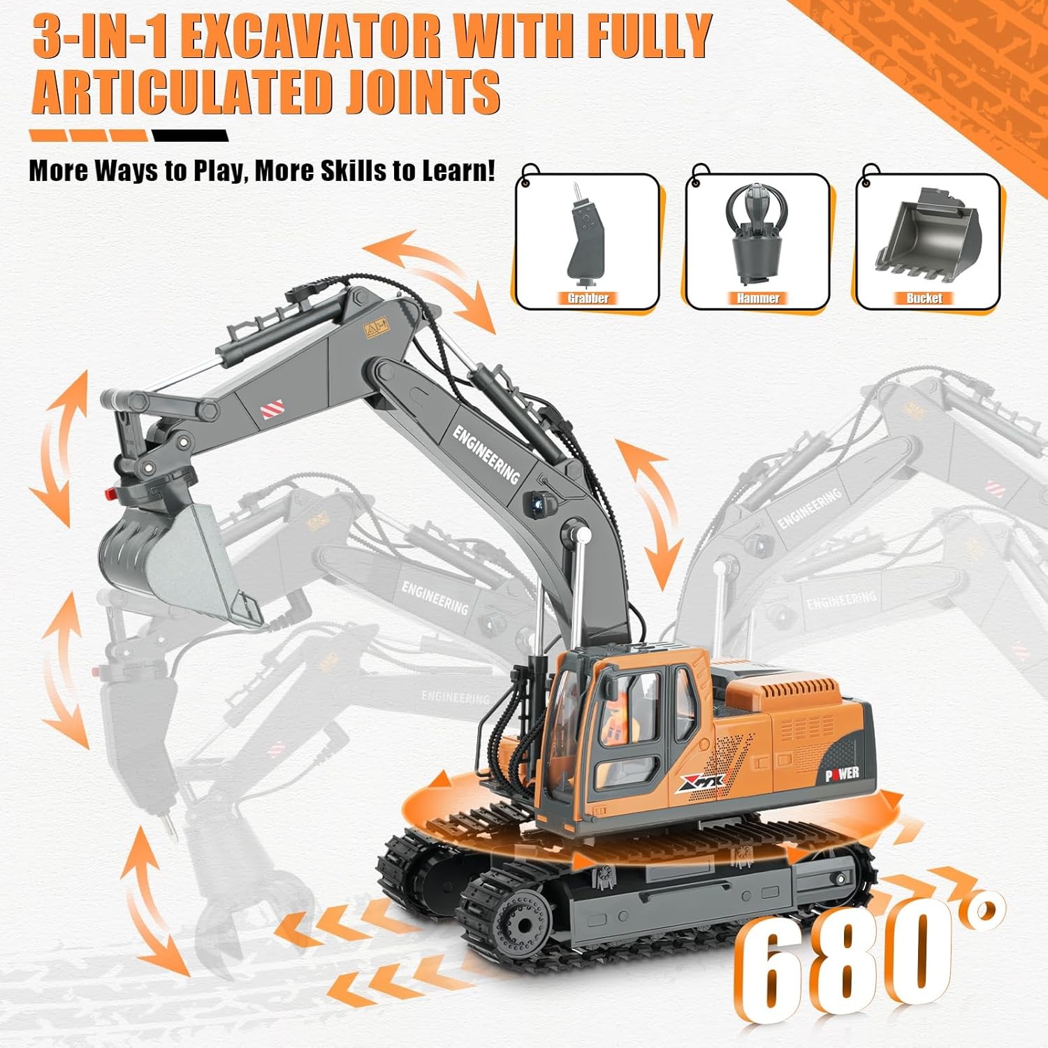 RC Excavator Toy for Boys 3-12, 3-IN-1 Bucket/Claw/Drill, 2.4GHz 14 Channel Construction Truck with 680°Rotating, 2400mAh Battery/LED Lights/Realistic Sounds, Durable Engineering Vehicle Gift for Boys