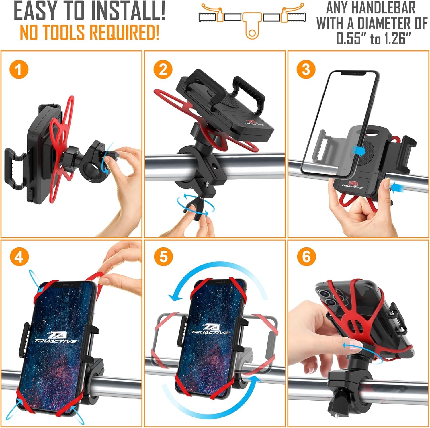 TruActive Premium Bike Phone Mount Holder | Universal Cell Phone Mount for 4"-7" Phones | Includes 6 Reusable Color Bands | Tool Free Handlebar Mount for Bicycle, Motorcycle, Electric Scooter, ATV