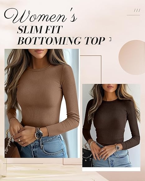 Ficerd 3 Pack Women's Ribbed Long Sleeve Tops, Crew Neck Slim Fit Undershirts Knit Basic Casual Stretch Layering Tee Shirts
