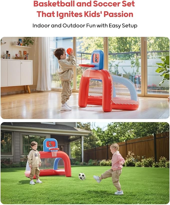 QPAU 2-in-1 Inflatable Toddler Basketball Hoop & Soccer Goal Set, Indoor Outdoor Sports Center Toys for Kids, Baby Toddlers Birthday Gift for 1 2 3 4 5 Year Old Boys Girls